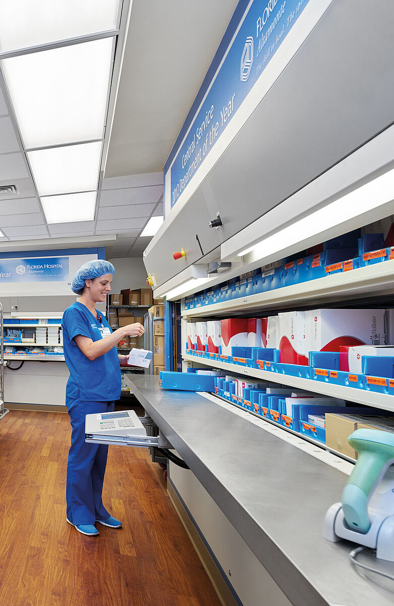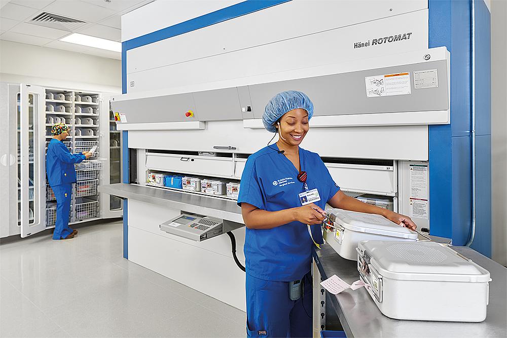There are two main storage options used in sterile processing areas and operating rooms in hospitals. Here in the UK, these are (more often than not) Traditional, rather than automated storage units. Traditional storage requires someone to physically locate and retrieve items, while automated storage units, as the name suggests, brings items to a specific location, whereby an operator needn’t move. This is sometimes referred to as G2P (“goods to person” or “goods to man” (G2M).