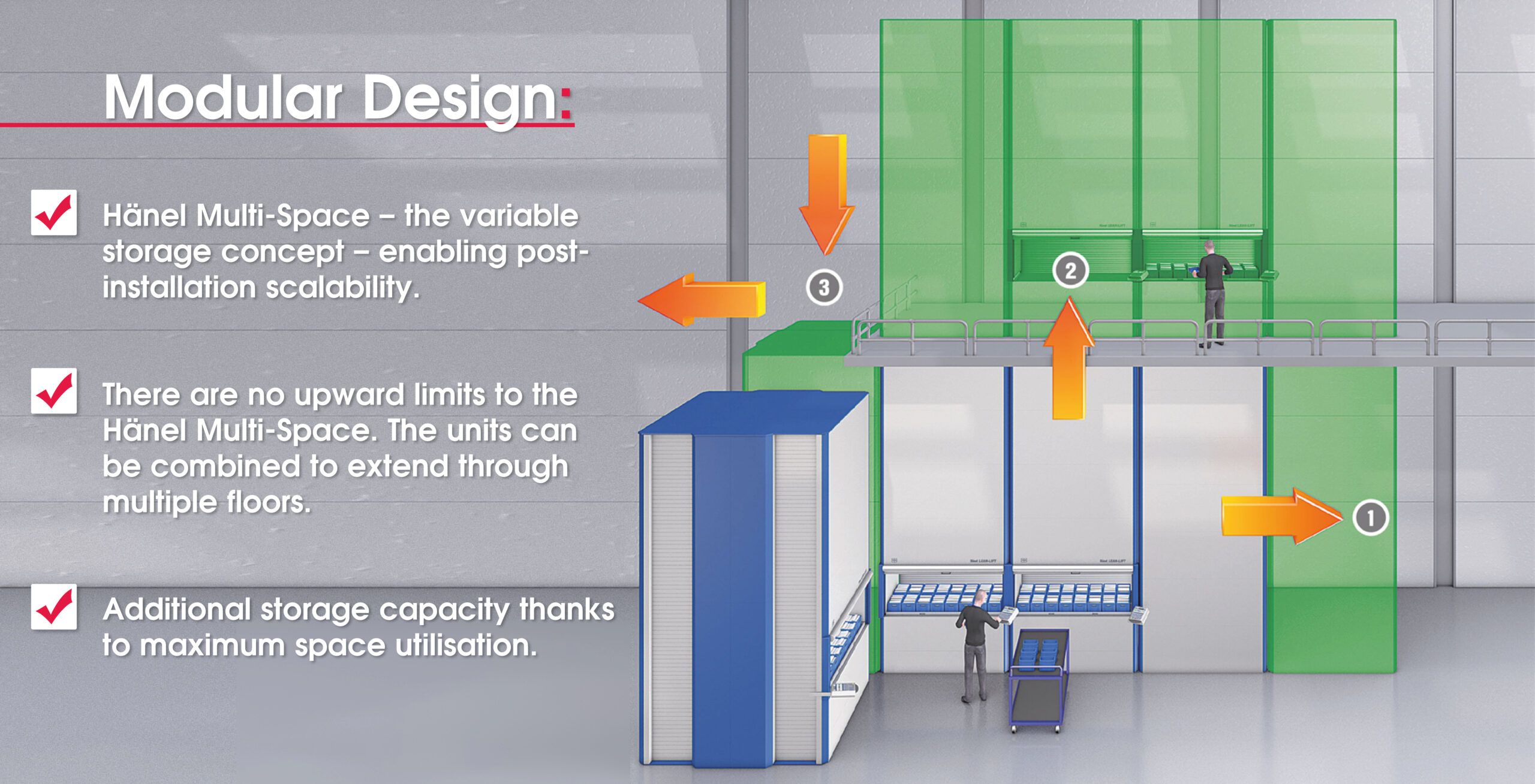 Whether it’s a stand-alone solution, or networked with other Multi-Space systems, or used in combination with Hänel Lean-Lifts and Hänel Rotomats – the Hänel Multi-Space offers another innovative solution for your intralogistics!