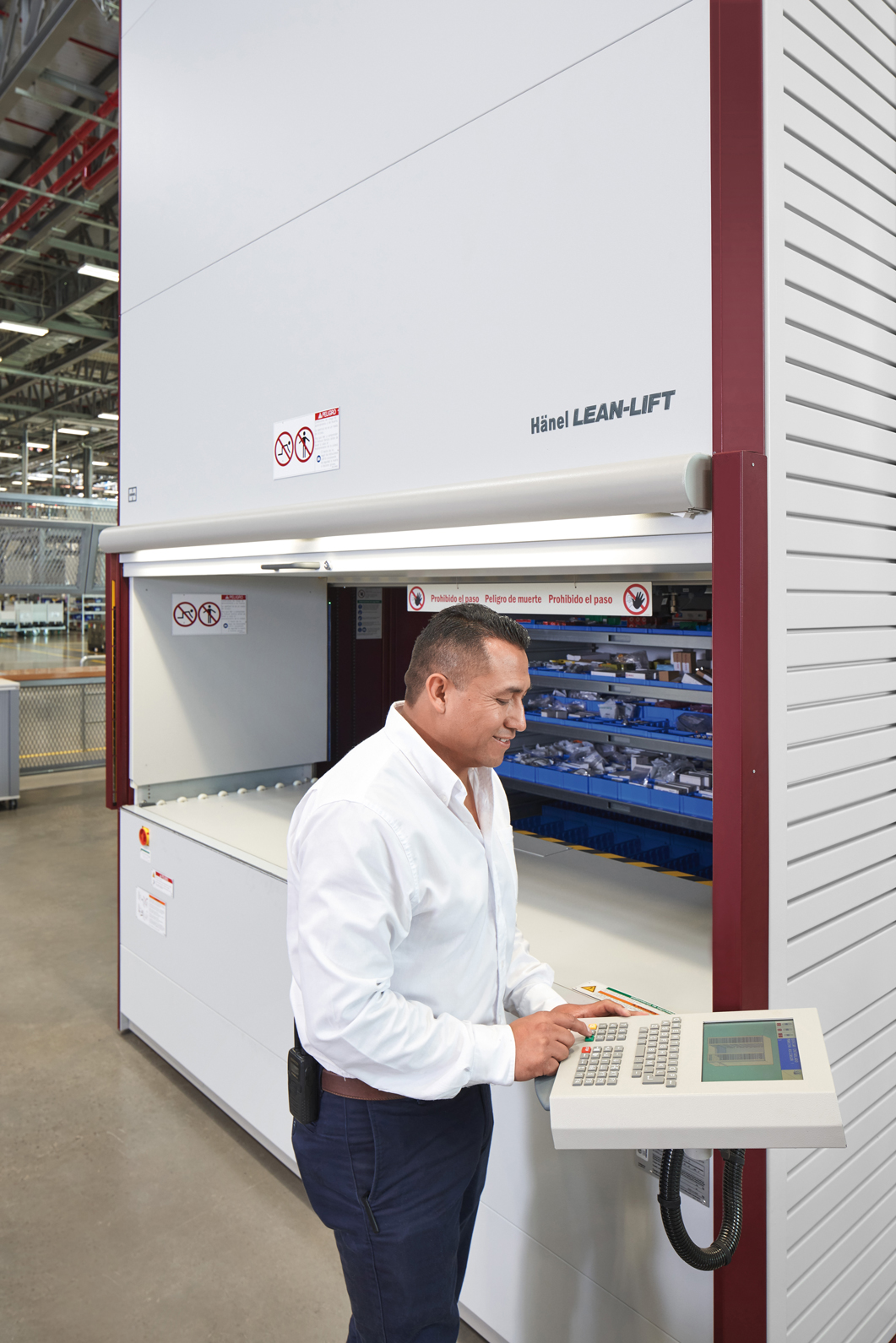 The Hänel Lean-Lift has a height of nearly 9 m and can handle a total load capacity of 60 tons – the system holds spare parts needed for production machinery.  The vertical Hänel lift has a very small footprint and features height-optimized storage to increase overall density.  The parts are systematically stored on Hänel multifunction containers.  The Hänel Lean-Lift utilizes the entire height of the building to ensure maximum storage capacity. The small footprint means that the automated system requires less floor space than conventional racks and shelves. The valuable space saved can thus be used for production purposes.