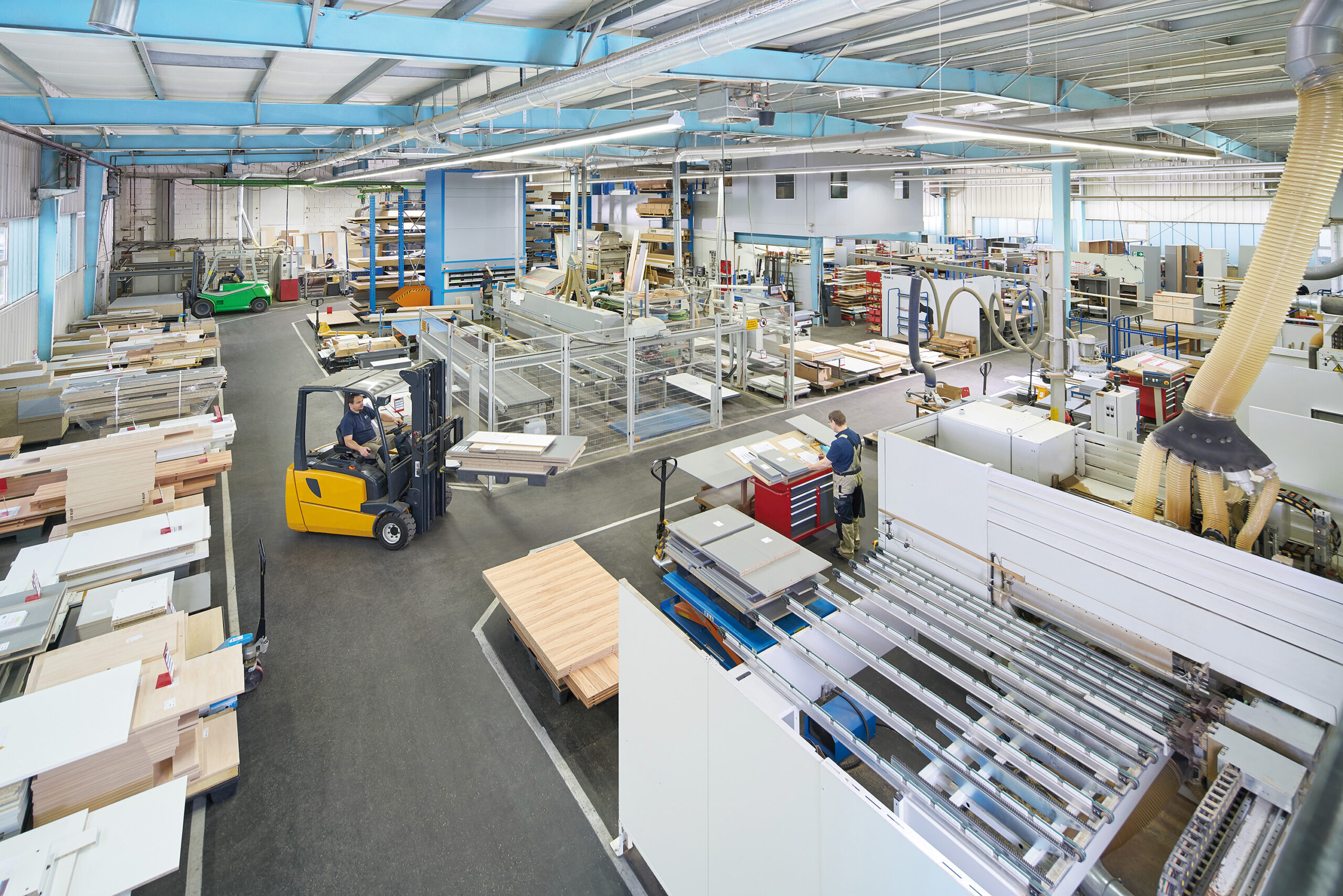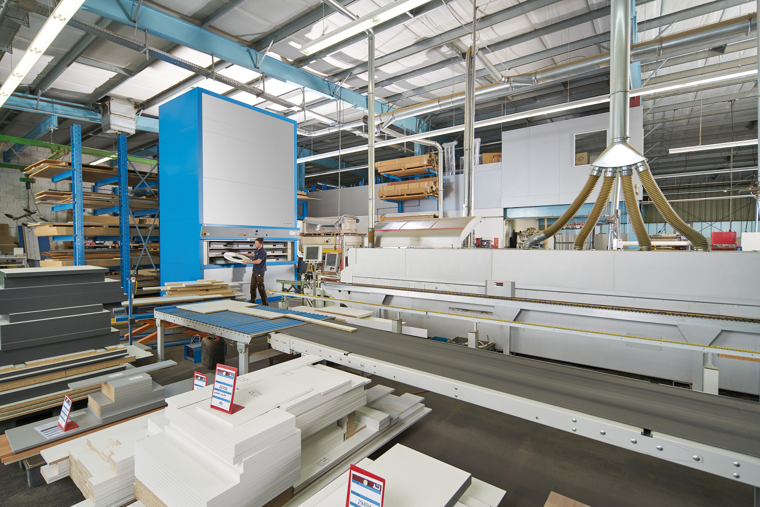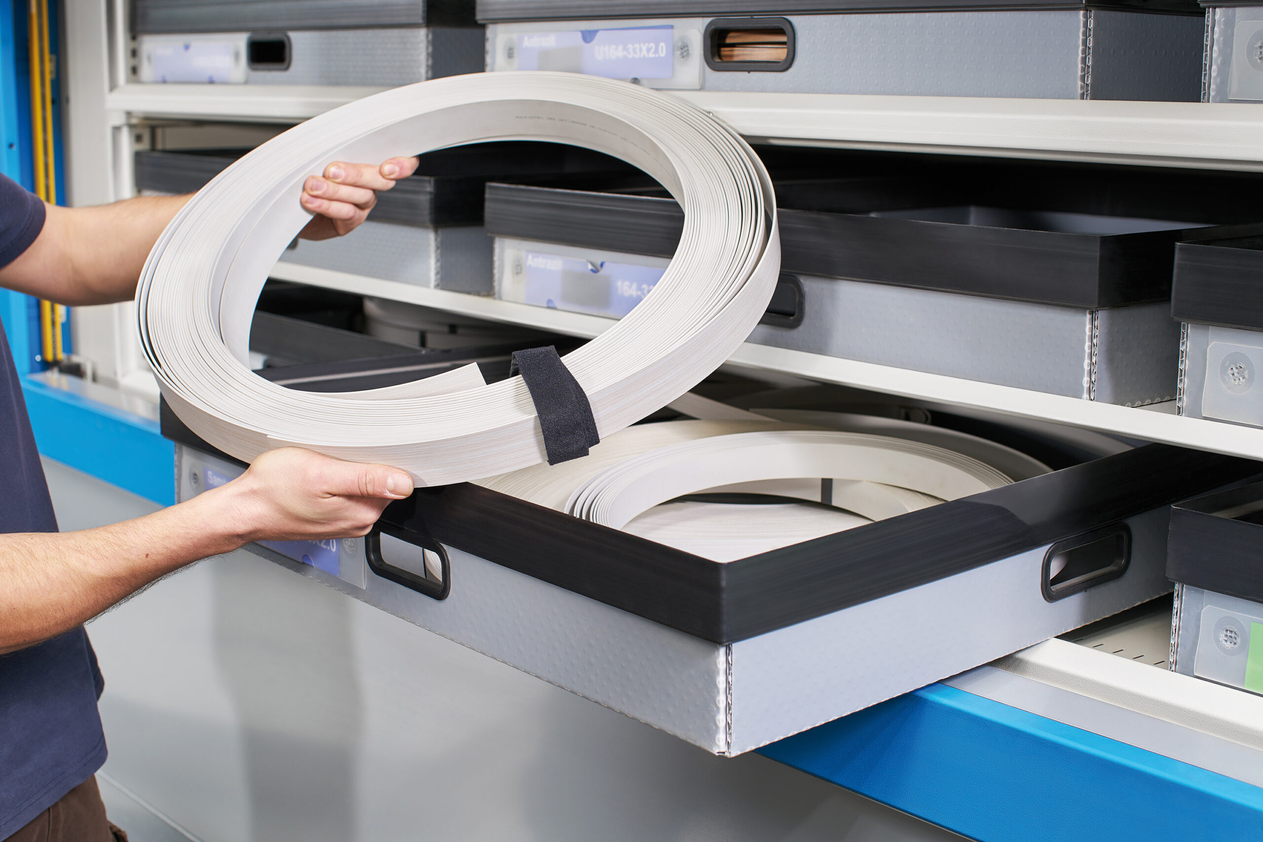 A Hänel Rotomat® storage system on the production floor serves as a material depot for adhesives and edge trimming mounted on reels. This material is fed into automated edging machines during the gluing and finishing process for furniture surfaces.