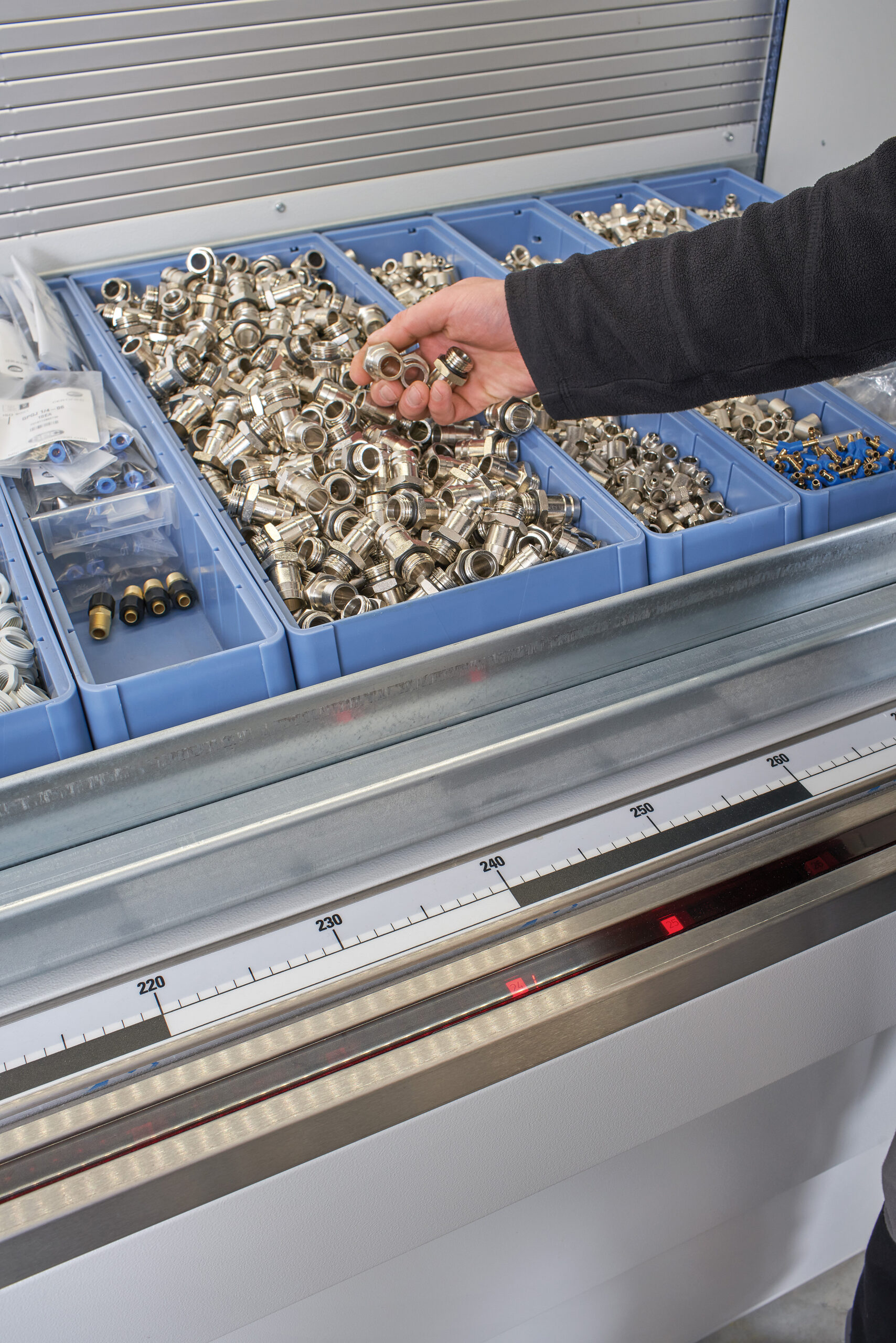 Employees can retrieve production parts and components from the Hänel lift systems at any time. It goes without saying that several items can be picked as batch orders for specified steps in the manufacturing process.