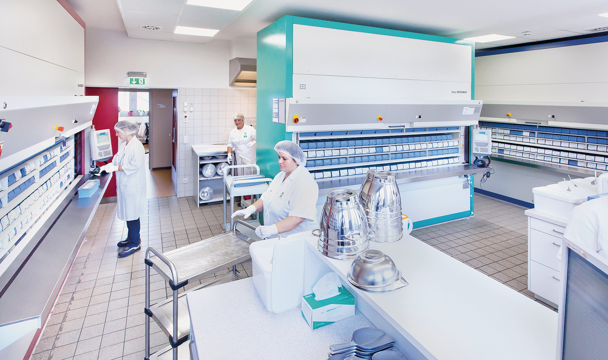 In collaboration with Hänel experts, some 1,300 ingredients such as croutons and spices were analysed and stored in two variants of special storage bins designed for three Hänel Rotomat systems. The multifunction carriers in the Rotomat systems each have 24 single or 12 double-sized bins. All of the bins have barcodes for automatic scanning.